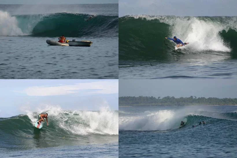 Andrew Read and his mates. A bunch of mid 40 year olds. Mates from school. Booked the boat a year ago. They are the archetypical blokes. Have been excited about this trip for a whole year. They get on board. They have video of the hotel in Singapore, the airport chaos, the car ride to the boat, and every nook and cranny of the boat. They hit the surf like they are going to get their money's worth. 2 hours later we have 2 broken boards, 3 stitches, multiple reef scrapes and 7 very happy blokes. By the end of the day they are surfed out, sore, and sipping Bintangs. The pros hit us the next day and we run to Maccas and they score the best waves of their lives. The pros hit us again and they end up surfing with Danny wills, Dean Morrison, and the Hawaiins. Everyone is friendly and they have a blast. At one stage they are sitting in the dinghy, cheering all the boys, taking photos with their digital cameras and having a blast. They are stoked to have seen all the pros and surfed with them. Raving that night over how they could tell their mates and show em the photos.
